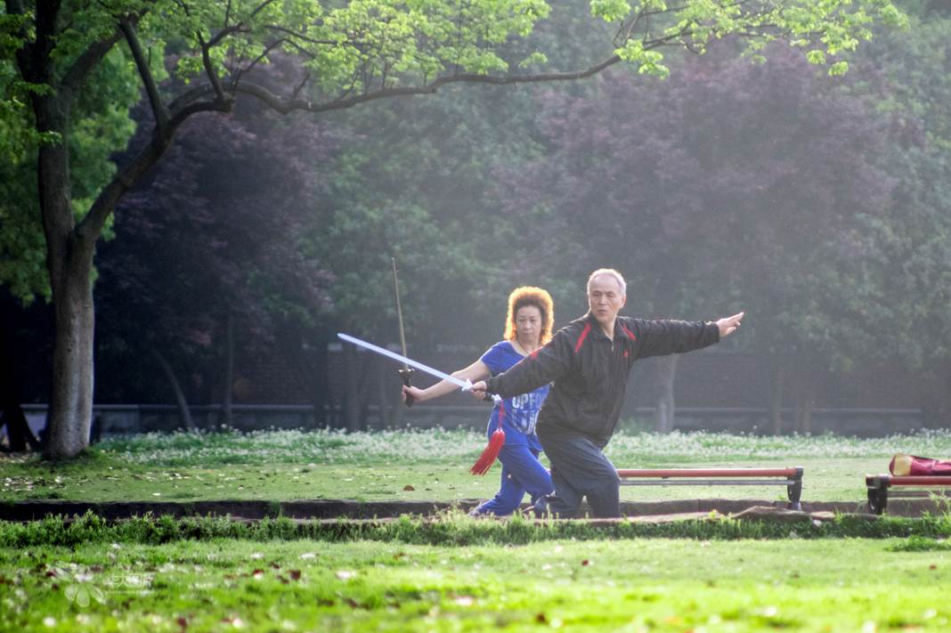 清晨的阳光透过树叶洒落,老年教工们摆好架势,挥舞手中的软剑,一招一式间尽是从容。