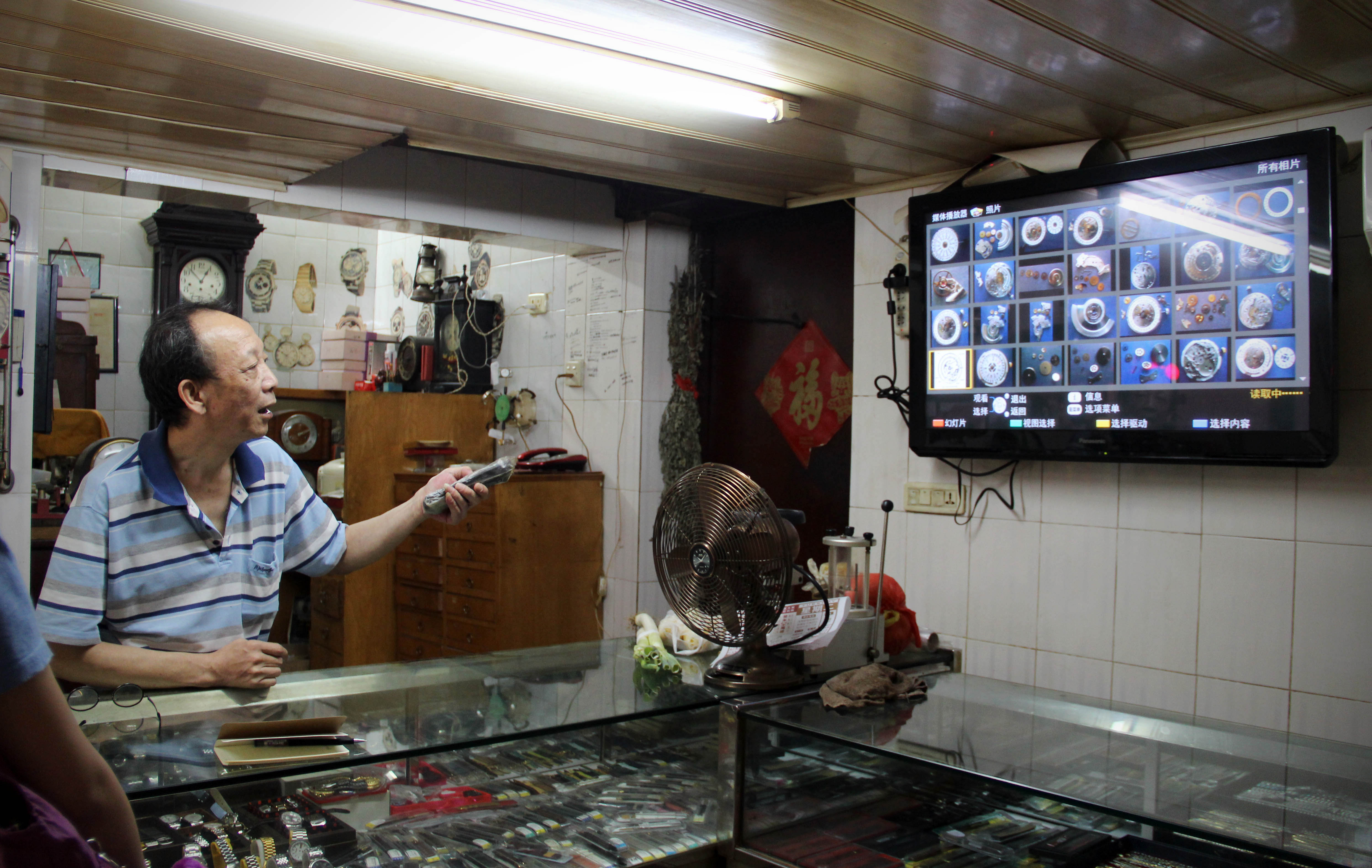 老店的老板叫袁正建,袁师傅说这家老店铺在解放前就已经有了,是几位退休下岗的职工一起捯饬起来的。三大改造和文化大革命的时候被迫关闭过,一路分分合合几次,如今转到了他们几个退休转业的人手里,也算是一种传承。跟其他老店不同的是,袁师傅的店里有一台很大的液晶电视机。有客人来修表时,如果遇到要换原件或客人有不懂的地方,袁师傅就会打开电视机把里面存着的各种表的内部结构图给客人看。“让他们修得明明白白。”不仅有图片,电视机里面还有袁师傅从各处搜罗来的关于钟表的视频纪录片,俨然一个中国近现代表业数据库。