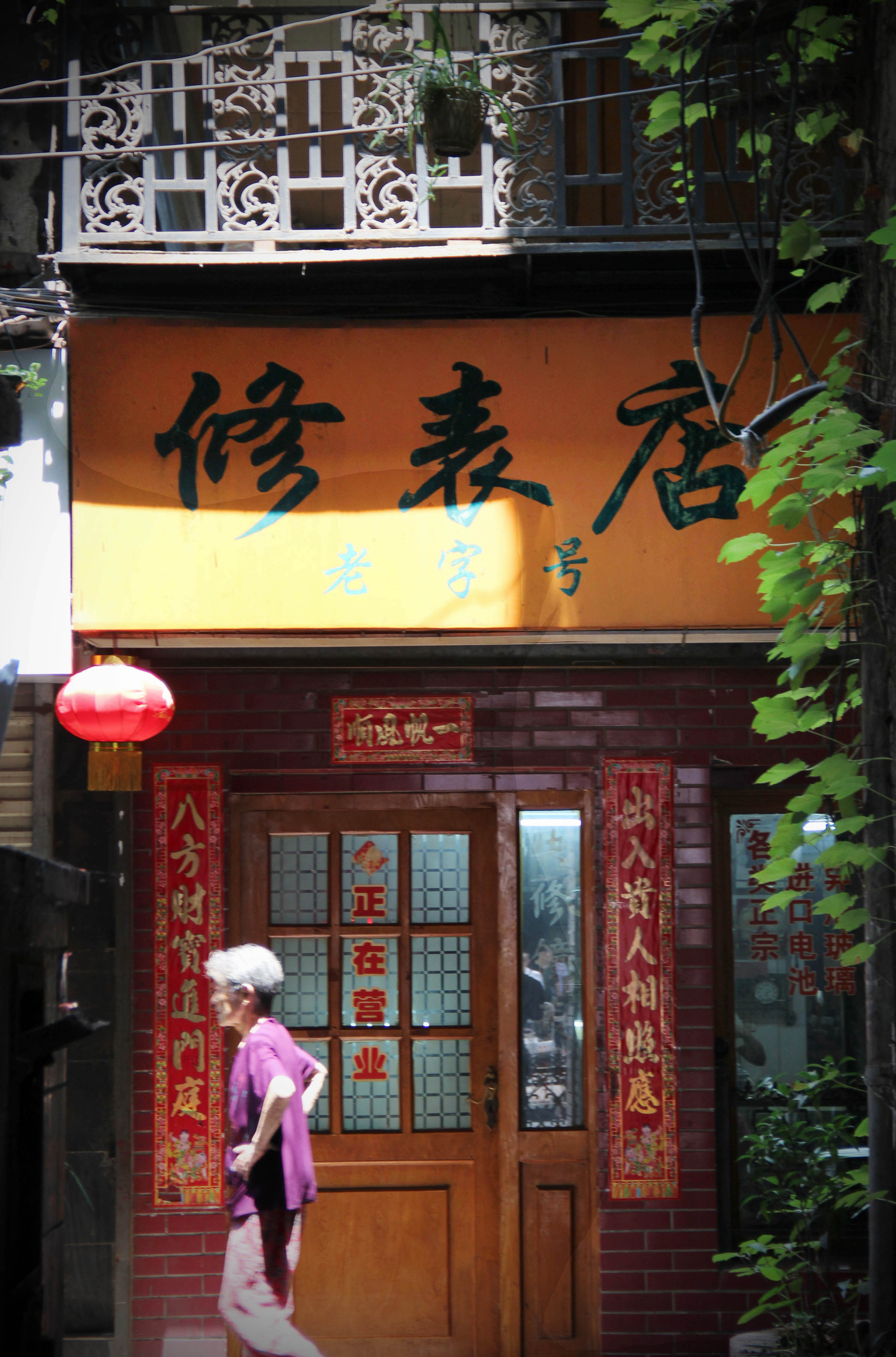 这家修表店在一片爬山虎的掩映之下,没有店名,只有“修表店”三个大字和底下的“老字号”三个小字。