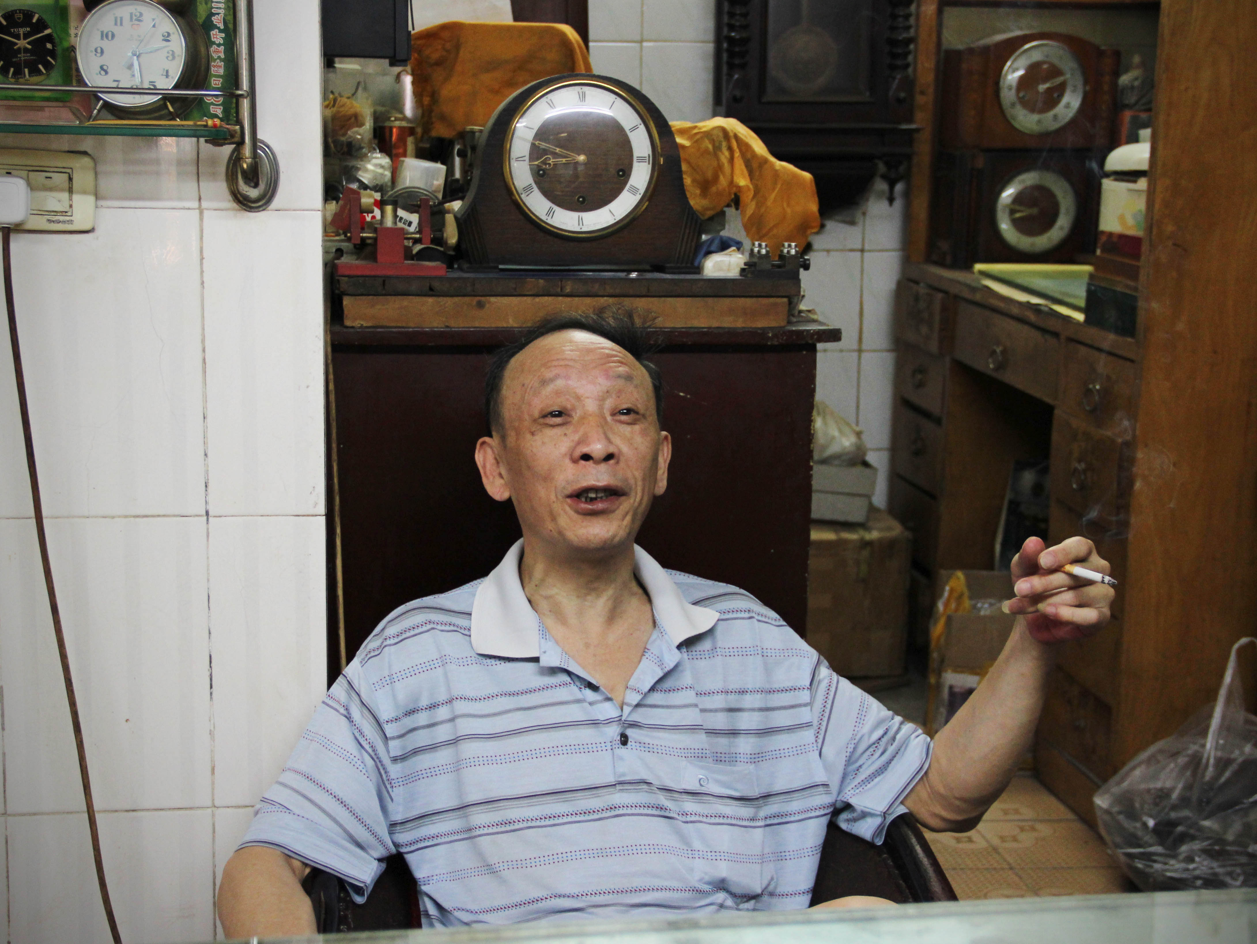 袁师傅比较健谈,懂得多,阅历多,闲暇时他会坐在他从各地搜集来的老钟表周围,向顾客和一些感兴趣的人谈论他和钟表的故事。