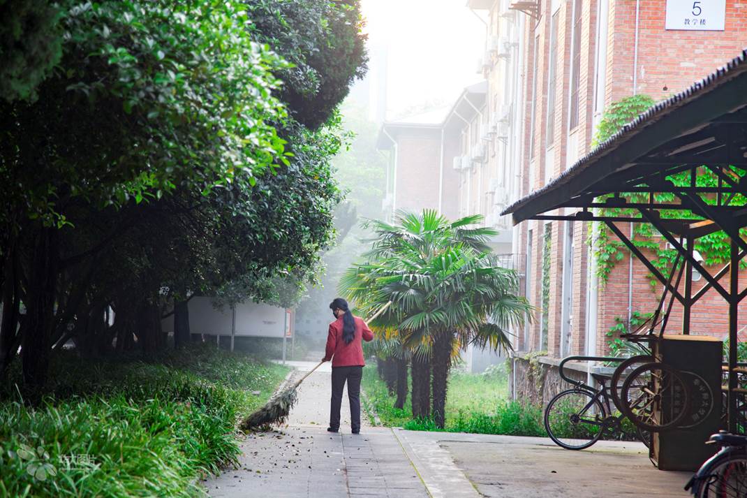 生科楼前的空地上,清洁阿姨拿着大扫把,清扫着一夜的落叶,木犀树下,混着清香,每片砖瓦都干净整洁。